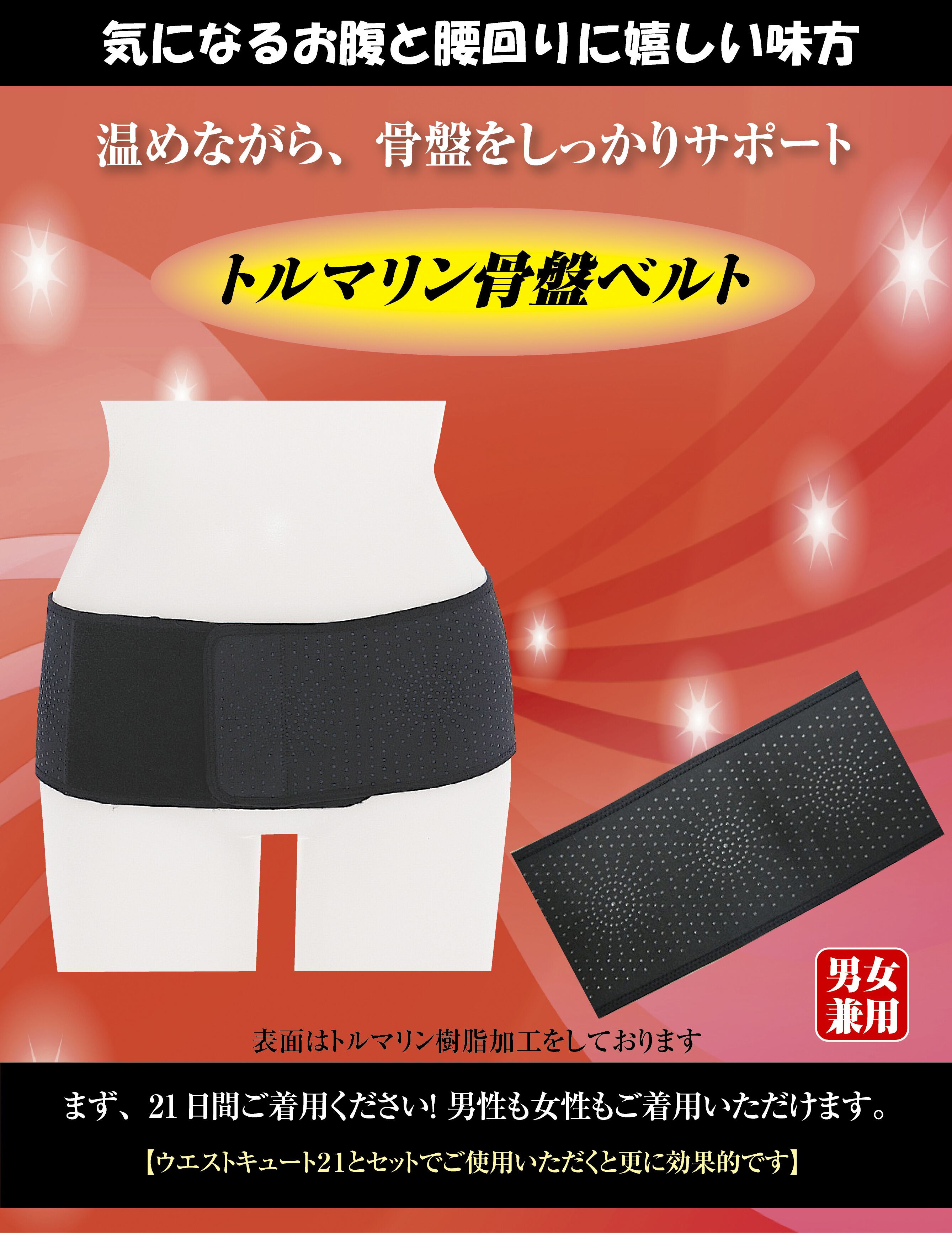 トルマリン骨盤ベルトは、開きがちな骨盤を温めながら締めてくれます。骨盤を締めることで、ゆがんだからだを整えサポートしてくれます。